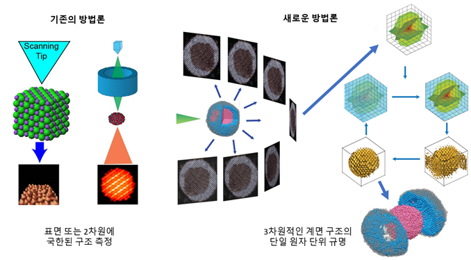 물질 계면에서의 원자들의 배열은 계면을 이루는 각각의 물질과는 다른 형태로 만들어지는 경우가 많고, 이에 따라 기존의 물질에서는 볼 수 없었던 새로운 물성이 종종 관측됩니다. 뿐만 아니라 nm 수준의 공정을 뛰어넘어 sub-nm 스케일, 즉 단일원자에 가까운 컨트롤을 요하는 기술시대에는 계면효과가 소자의 기능성에 큰 영향을 미치게 됩니다. 그러나, 이러한 계면에서의 물리현상들은 아직 많은 부분이 미규명 상태입니다. 기존의 X선 회절을 이용한 전통적인 측정 방식으로는 계면에서의 원자 구조, 즉 어떠한 원자들이 어떤 위치에 배열되어 있는지를 파악하는 것이 매우 어렵기 때문입니다. 또한 내부에 묻혀 있는 3차원 계면구조의 특성상 표면측정이나 2차원적인 투과측정으로도 정확한 원자 구조를 알아내는 것이 어렵습니다.