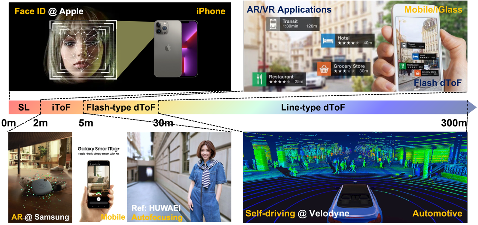 3D 이미지센서는 색상 정보만을 획득하는 일반 이미지센서와 달리 물체까지의 거리 정보를 측정할 수 있는 센서로 주로 라이다(LiDAR, Light Detection and Ranging)로 불리며 전파를 사용하여 거리를 측정하는 레이더와 달리 빛을 이용하기 때문에 거리 정밀도가 높은 고해상도 3D 영상을 얻을 수 있어 각광받고 있습니다. 라이다는 Structured Light (SL) 기술이나 Time-of-Flight (ToF) 방식 등 다양한 방법으로 구현할 수 있으며 사용자가 원하는 거리 및 해상도에 따라 최적의 기술이 활용되고 있는데요. 일례로 사용자 인식을 위해 널리 활용되는 얼굴 인식은 1미터 이내의 가까운 거리 정보가 필요하므로 SL 기술이 주로 사용되고 있고, 스마트 홈이나 스마트 공장, 서비스 로봇 등에서 원하는 20~30미터 수준의 중거리 어플리케이션에는 indirect ToF (iToF) 혹은 플래시 direct ToF (dToF) 기술이, 자율주행차에서 필요한 100미터 이상의 원거리는 스캔 dToF 기술이 주로 채택됩니다.