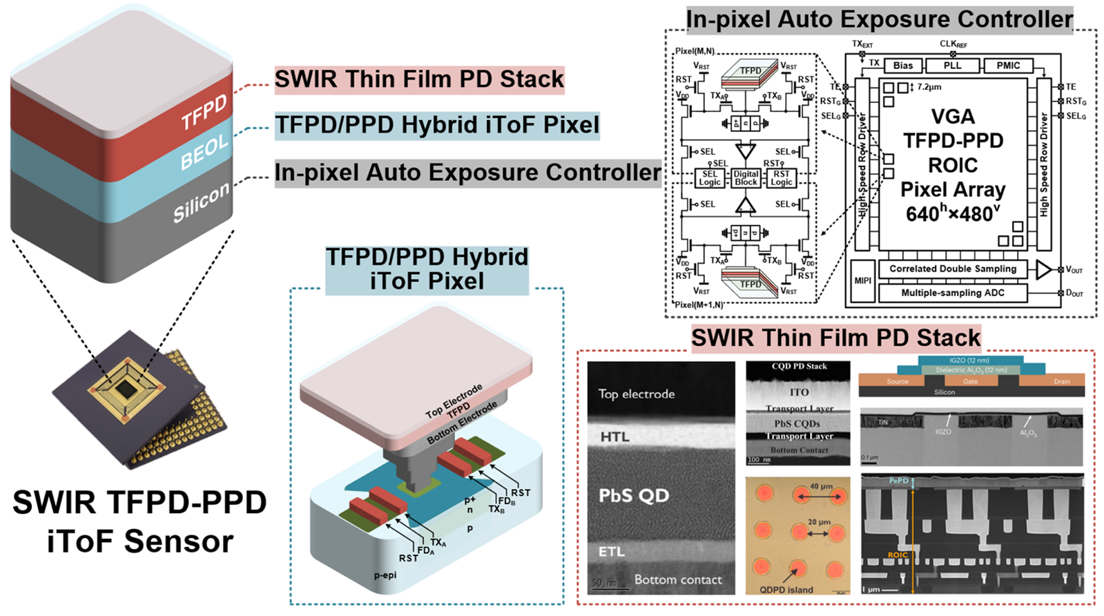 여러 가지 기술 중에서 iToF 방식은 변조된 빛의 위상 차이를 감지하여 거리 정보를 획득하는 방법으로 성숙된 CMOS 공정 기술을 그대로 활용할 수 있을 뿐 아니라 픽셀 구조가 단순하여 고해상도 3D 영상을 얻기에 가장 좋기 때문에 마이크로소프트, 소니, 삼성전자 등 전세계 유수의 기업들이 개발해오고 있습니다. 하지만 외부 광원에 쉽게 포화되고 악천후 대응성이 낮아 실외 사용이 어렵고 최대 감지 거리가 10미터 이내로 짧아 시장 규모가 상당히 제한적입니다. 본 연구에서는 상술한 iToF 기술의 단점을 해결하기 위해 Short Wave Infrared (SWIR) 광원을 사용하는 iToF 센서를 개발하고자 합니다. SWIR 대역은 1~2µm 사이의 파장을 갖는 적외선으로 태양광에 포함되지 않거나 세기가 약한 파장이 있어 실외광에서 자유로운 편이고, 산란도가 낮아 심한 안개 상황에서도 뚜렷한 이미지를 얻을 수 있어 악천후 대응이 용이하며, 육안에 감지되지 않고 망막에도 피해를 주지 않아 광 출력을 높여 최대 측정 거리를 늘리기에도 유리합니다. 하지만 SWIR 광원은 실리콘 포토다이오드로는 감지할 수 없는 큰 문제를 갖고 있습니다. 저희는 SWIR 광원에 반응하는 양자점 소재를 활용하여 박막 포토다이오드 소자를 만들고 CMOS 웨이퍼에 모노리식하게 집적하는 해결책을 제시하고자 합니다.