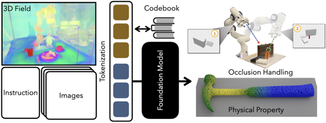 그림 1. 최종연구목표. 3차원 공간에 대한 직접적인 인지를 할 수 있는 로봇기반모델. 이를 통해 시점 변화를 통한 가려짐(occlusion) 처리, 도구의 물리적 특성을 고려한 활용이 가능.