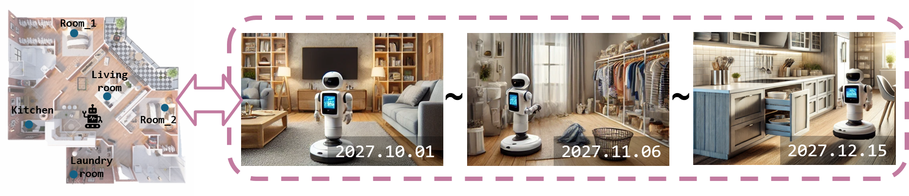 AI와 로봇 기술의 발전으로, 제조업에서의 자동화를 넘어 가정, 회사, 공공기관 등 다양한 장소에서 서비스 제공과 물품 운반이 가능한 자율 이동 로봇에 대한 기대가 높아지고 있습니다. 특히 최근 거대 언어 모델(LLM)과 같은 기술이 접목되면서 로봇과 사용자 간의 상호작용이 더욱 유연해졌습니다. 그러나 장기간 반복적으로 임무를 수행하는 이러한 서비스 로봇에는 특정 공간에서 누적된 관측치를 학습하여 공간의 특수성을 이해하고 이를 바탕으로 임무를 점점 더 효율적으로 수행할 수 있는 기술이 필요합니다. 기존 항법 기술과 범용 LLM 활용 기술로는 이러한 요구를 충분히 충족시키기 어렵습니다.